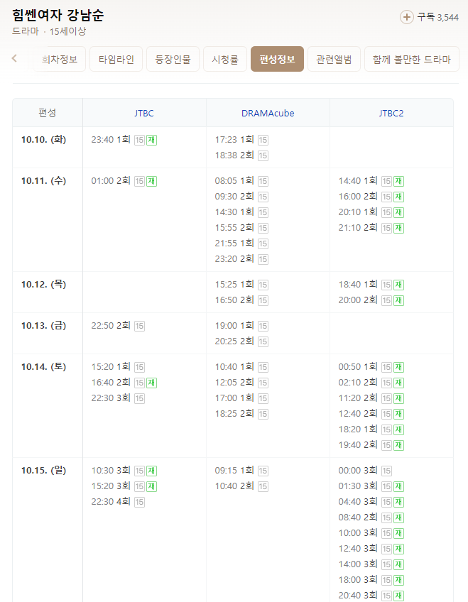 재방송 일정은 아래 참고하시면 됩니다. JTBC, JTBC2, DRAMAcube 에서 「힘쎈여자 강남순」 재방송을 보실 수 있습니다.