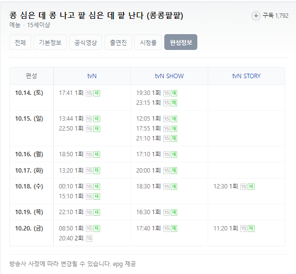 콩콩팥팥 재방송 정보는 아래 참고해보세요. tvN, tvN SHOW, tvN STORY 에서 재방송 보실 수 있습니다